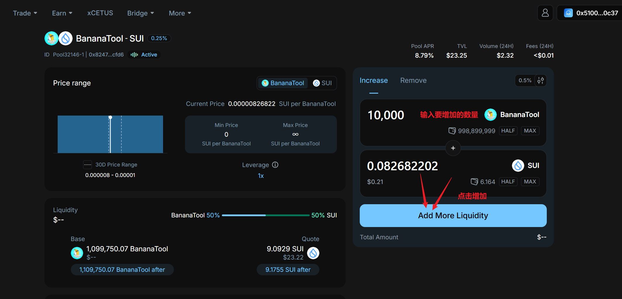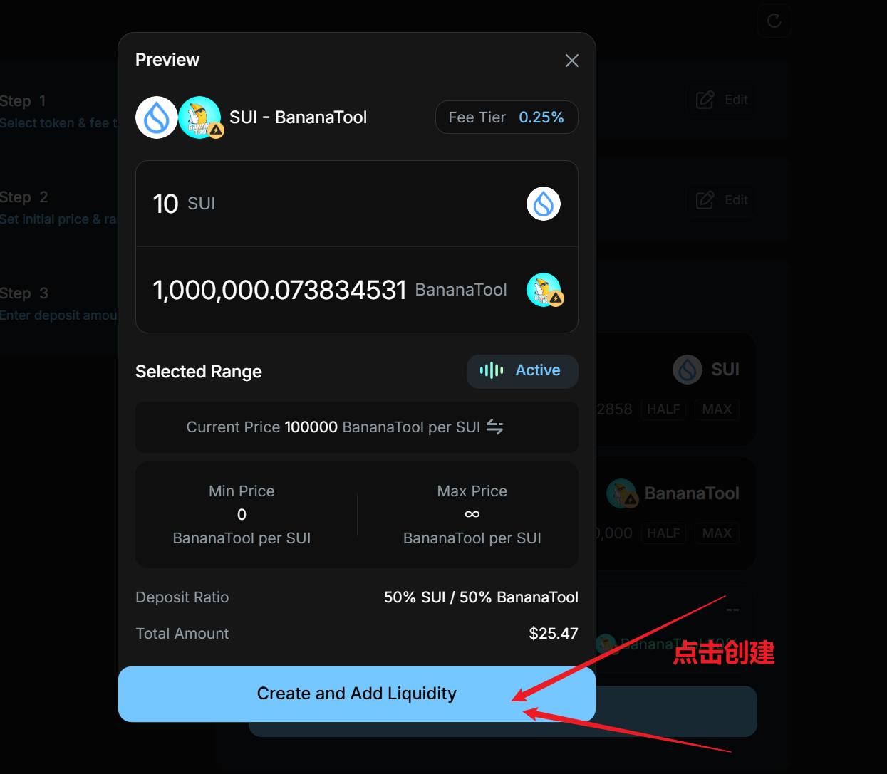 之后，我们填写要加池子的金额。例如，我选择加10个SUI，交易所会自动给我配对1亿个左右的BananaTool，确认数量后，点&#x51FB;**`Crate按钮`**&#x5373;可