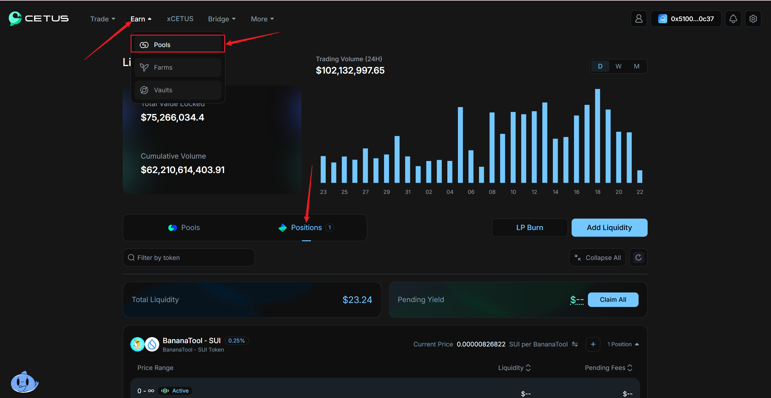 连接成功后，我们能在右上角看到钱包地址。之后我们点击左上角的**Earn**按钮，找到**Pools**，进行加池操作