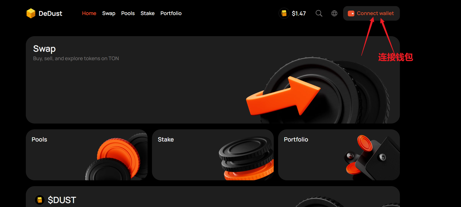 首先，我们打开DeDust的官网：<https://dedust.io/>，点击右上角`Wallets`，根据提示再点击`Connect Wallet`连接钱包